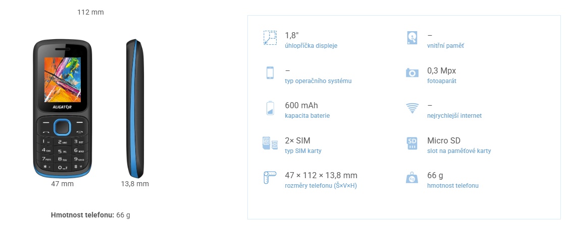 Kontrastní barevný displej je dobře čitelný a má ostré zobrazení. Vašim přátelům můžete posílat nejen textové zprávy, ale třeba i fotky nebo obrázky díky vestavěnému fotoaparátu a podpoře MMS. Mezi funkce telefonu Aligator D210 patří alarm, svítilna, FM rádio nebo Bluetooth pro připojení například bezdrátových sluchátek. Klasický černý vzhled telefonu je ozvláštněn designovým pruhem v modré barvě, se kterým vždy ladí i lemování středového tlačítka menu.