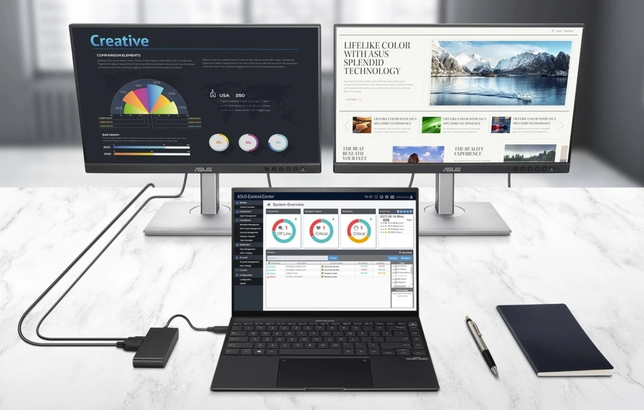 Díky podpoře dvou externích monitorů s rozlišením až 4K rozšíří pracovní plochu a usnadní multitasking. Nechybí ani rychlé datové přenosy a stabilní síťové připojení přes LAN.