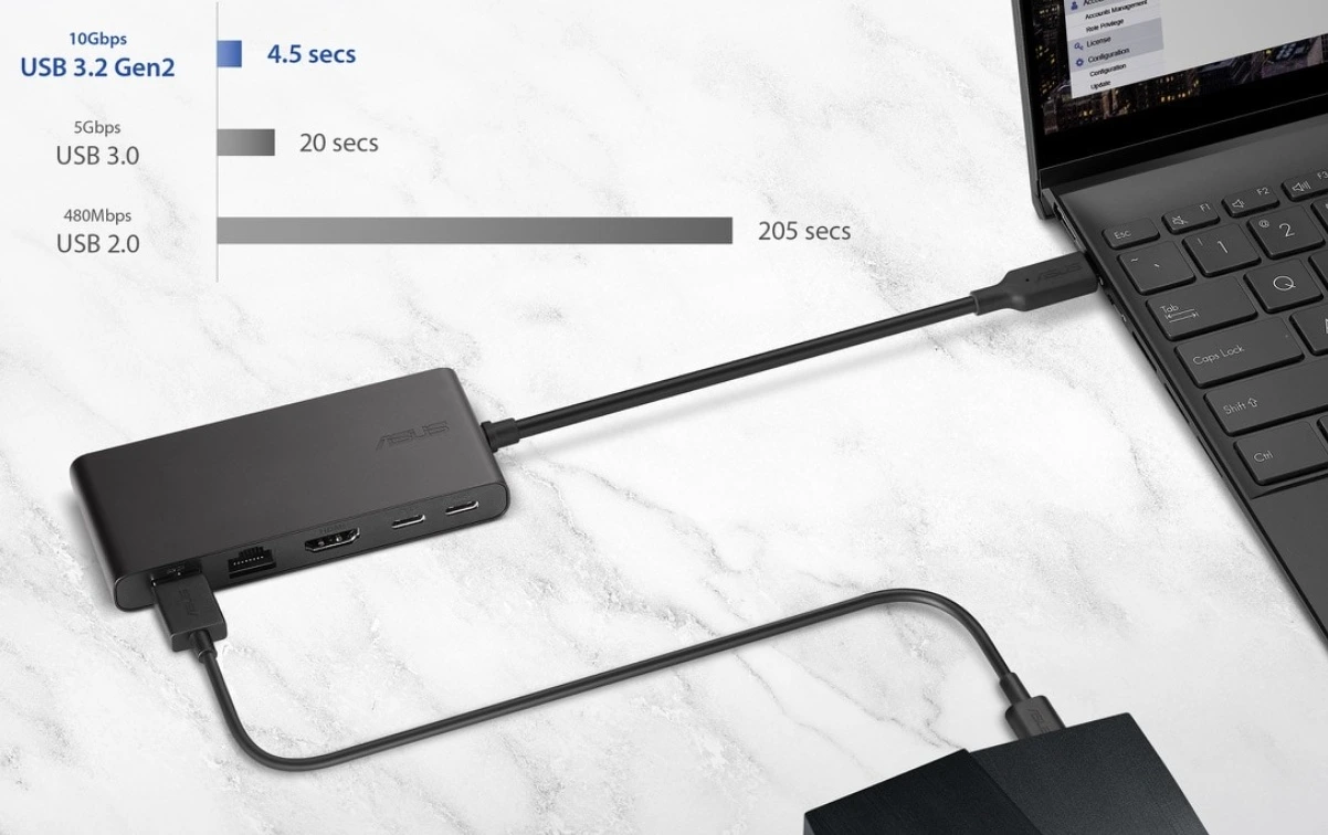 Díky USB 3.2 portům nabízí dokovací stanice přenosovou rychlost až 10 Gb/s. Přenos velkých souborů je rychlý a bez zbytečného čekání.